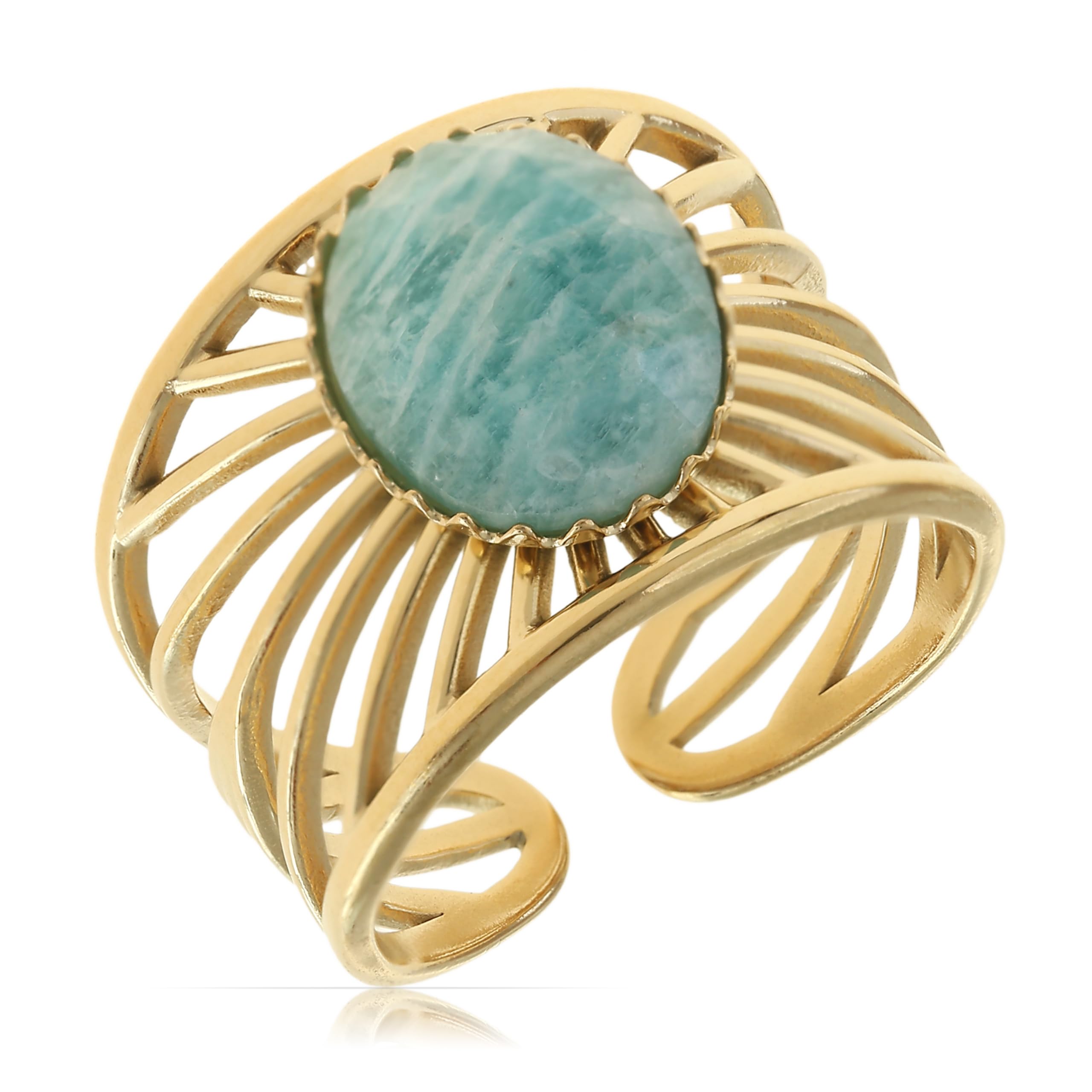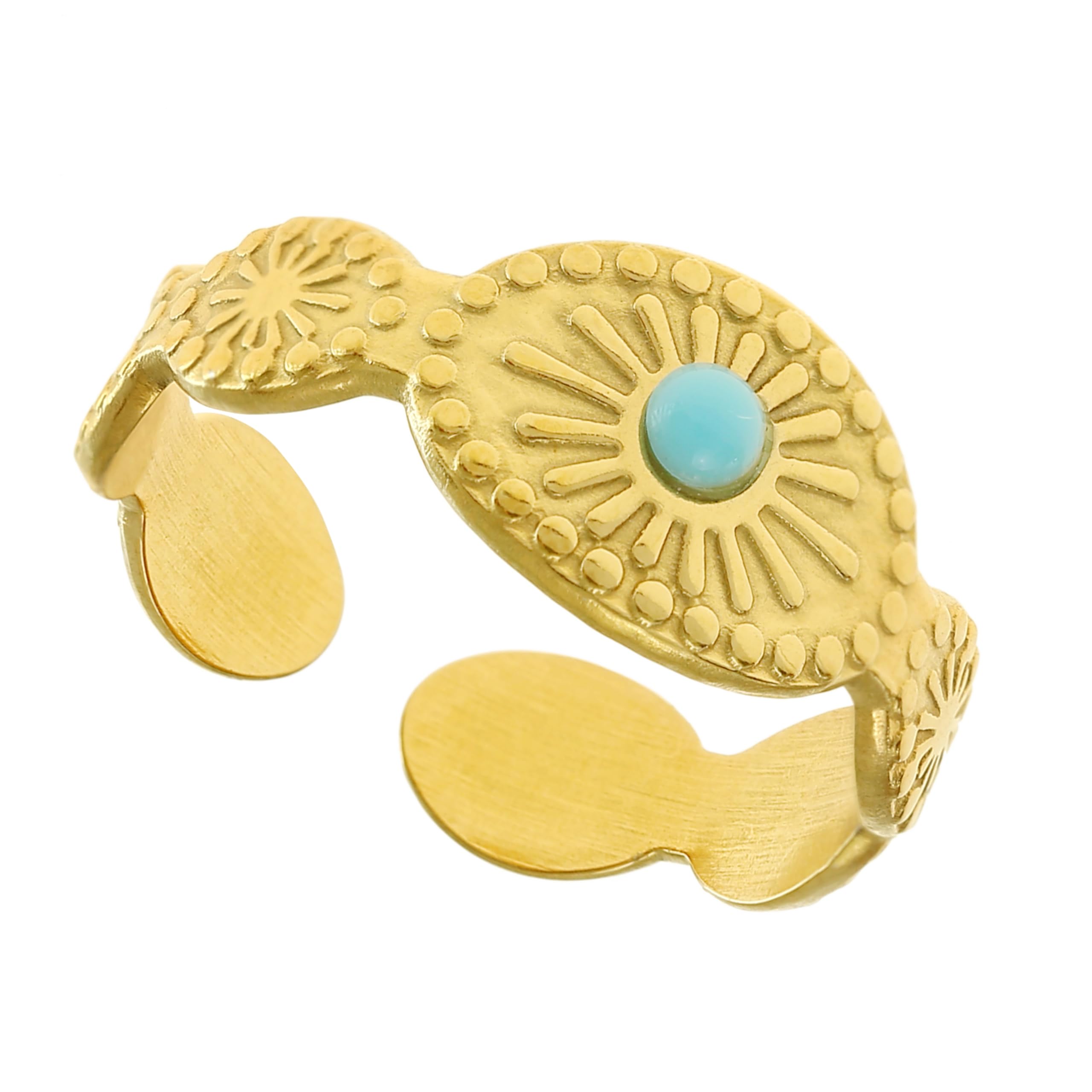 Feiner Ring aus echt vergoldeten Edelstahl mit einem himmlischen Halbmond, einem kleinen Stern, einer Sonne mit Mondstein besetzt und Vollmond mit kleinem Opalite.